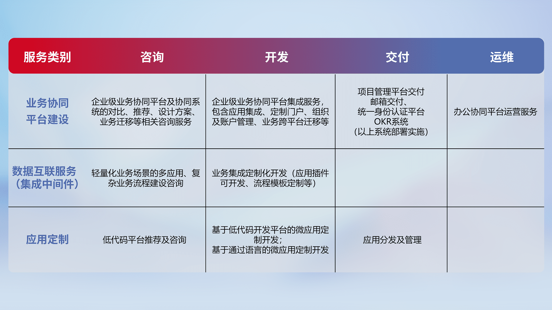 针对钉钉、、、、企微、、IDaas等平台级产品提供产品的规划、、、、方案、、、交付、、、定制化开发等服务,,实现如统一协同办公、、、智能客户服务、、、混合会议管理、、、、智能数据查询、、、、等业务场景,,,实现数字化转型。。